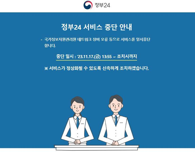 정부24 - 각종 민원 처리의 원스톱 서비스가 전면 중단