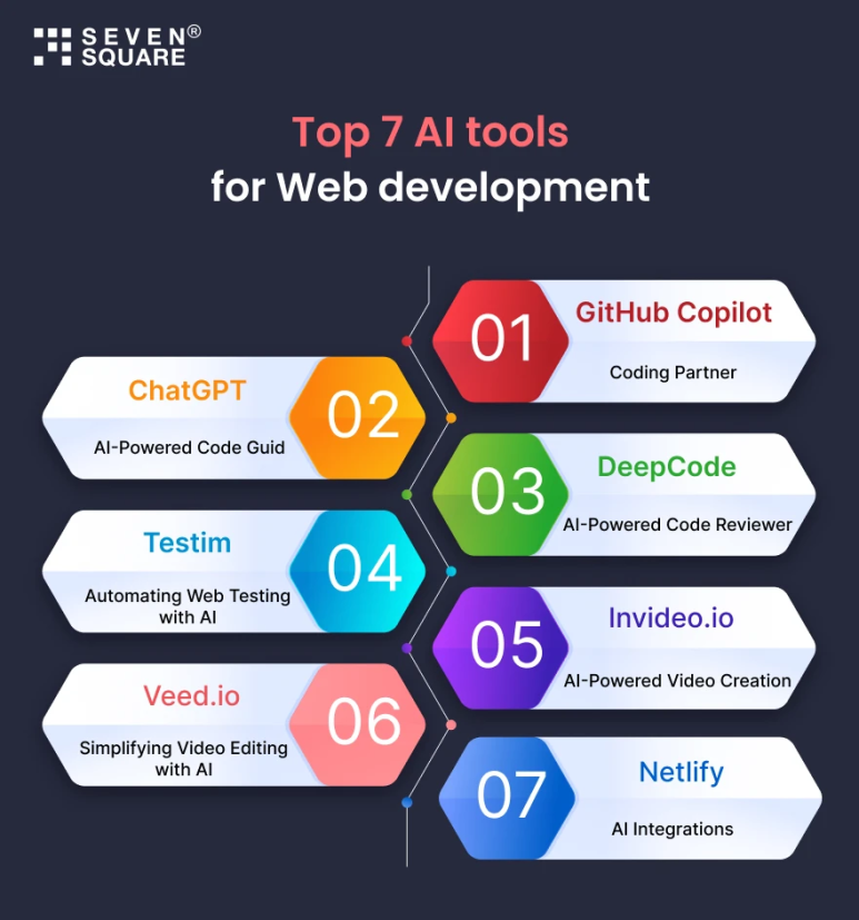 Top 7 AI tools for web development include GitHub Copilot, ChatGPT, DeepCode, Testim, Invideo.io, Veed.io, and Netlify with their specific AI functionalities