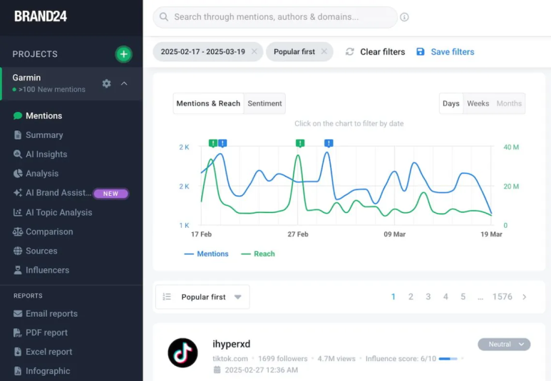 Brand24 dashboard showing AI-driven media monitoring with mentions and reach metrics over time in early 2025