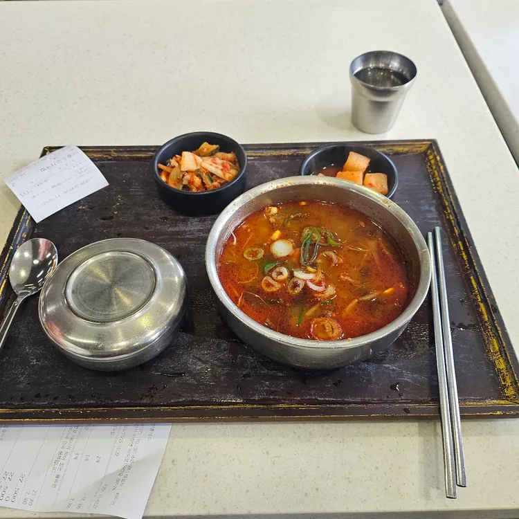 A bowl of beef soup with rice and traditional Korean side dishes at a rest area restaurant
