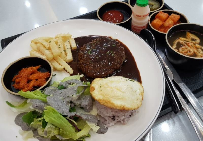 Korean highway rest stop meal featuring Hoengseong beef steak with sides and rice topped with fried egg