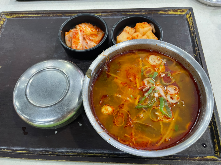 A traditional Korean beef soup meal with kimchi side dishes served on a tray