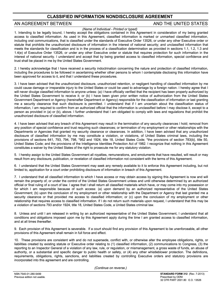 Classified Information Nondisclosure Agreement document outlining confidentiality obligations