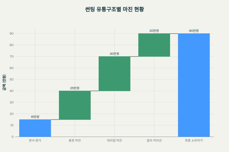 썬팅의 복잡한 유통구조와 각 단계별 마진을 보여주는 차트로, 최종 소비자 가격이 형성되는 과정을 시각화했습니다