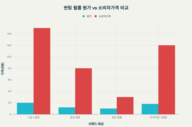 위 차트를 보시면 원가와 소비자가격의 격차가 얼마나 심각한지 한눈에 보이시죠? 고급 L필름의 경우 원가 20만 원에 소비자가격 150만 원으로 마진율이 무려 **650%**에 달합니다.