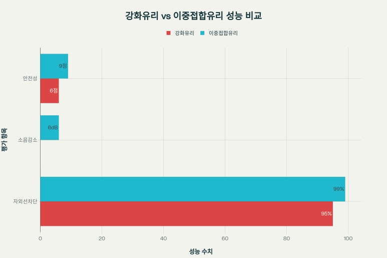 강화유리와 이중접합유리의 주요 성능을 비교한 차트입니다