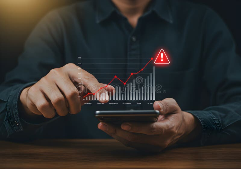 Stock market graph with a warning sign above a smartphone indicating investment risk