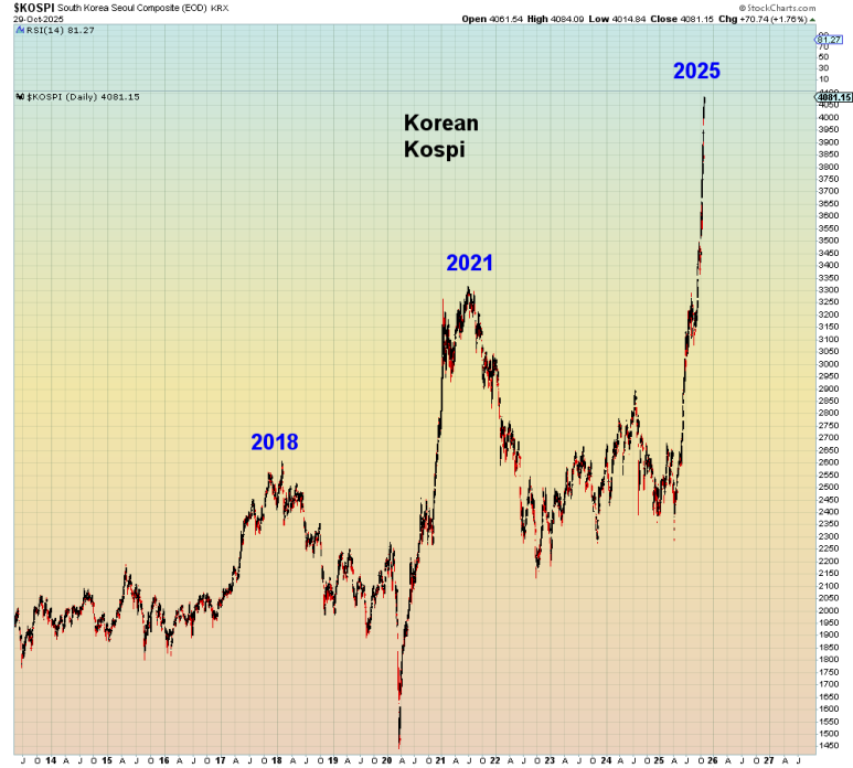 KOSPI index chart showing a significant rise by 2025 above 4000 points, highlighting market trends and potential overvaluation
